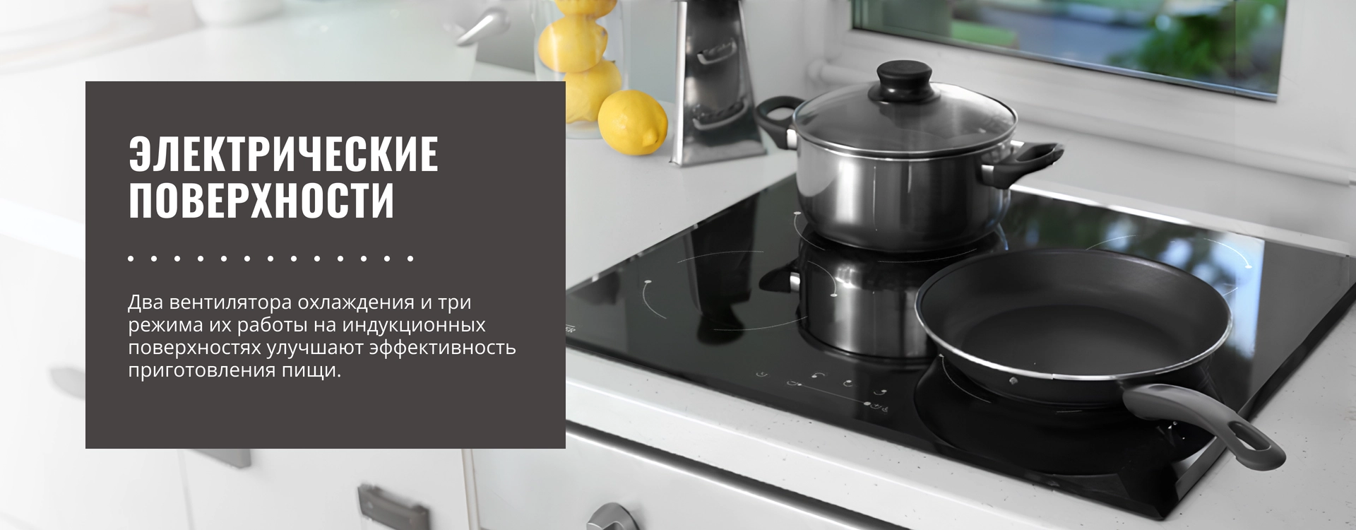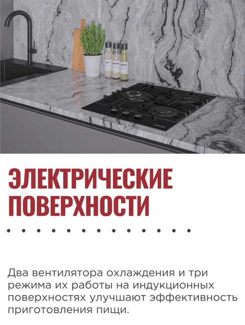 Охлаждение индукционной поверхности с помощью двух или трёх вентиляторов снижает потребление энергии, улучшает ТТХ и продлевает срок службы прибора
