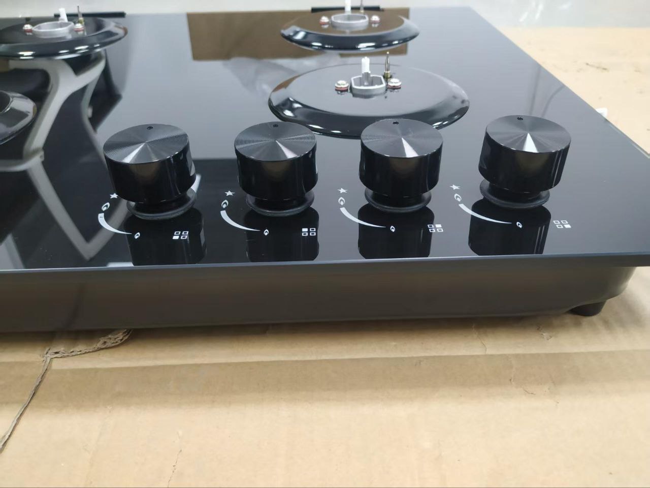 Черное закаленное стекло, Ручки с электроподжигом, Газ-контроль, Колпачки горелок, Газовые