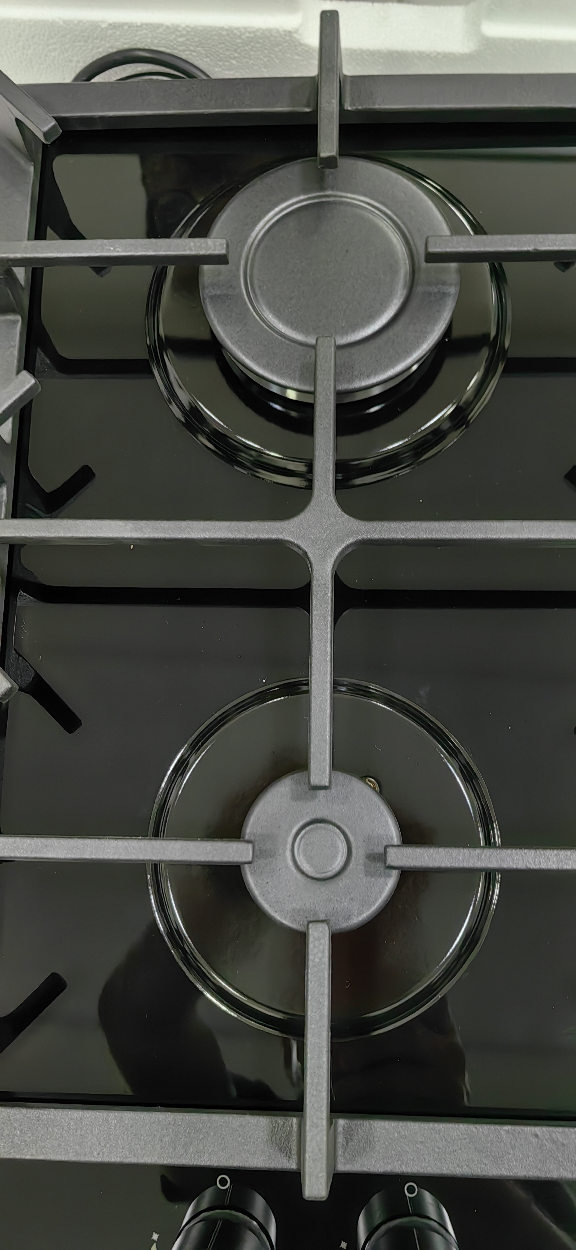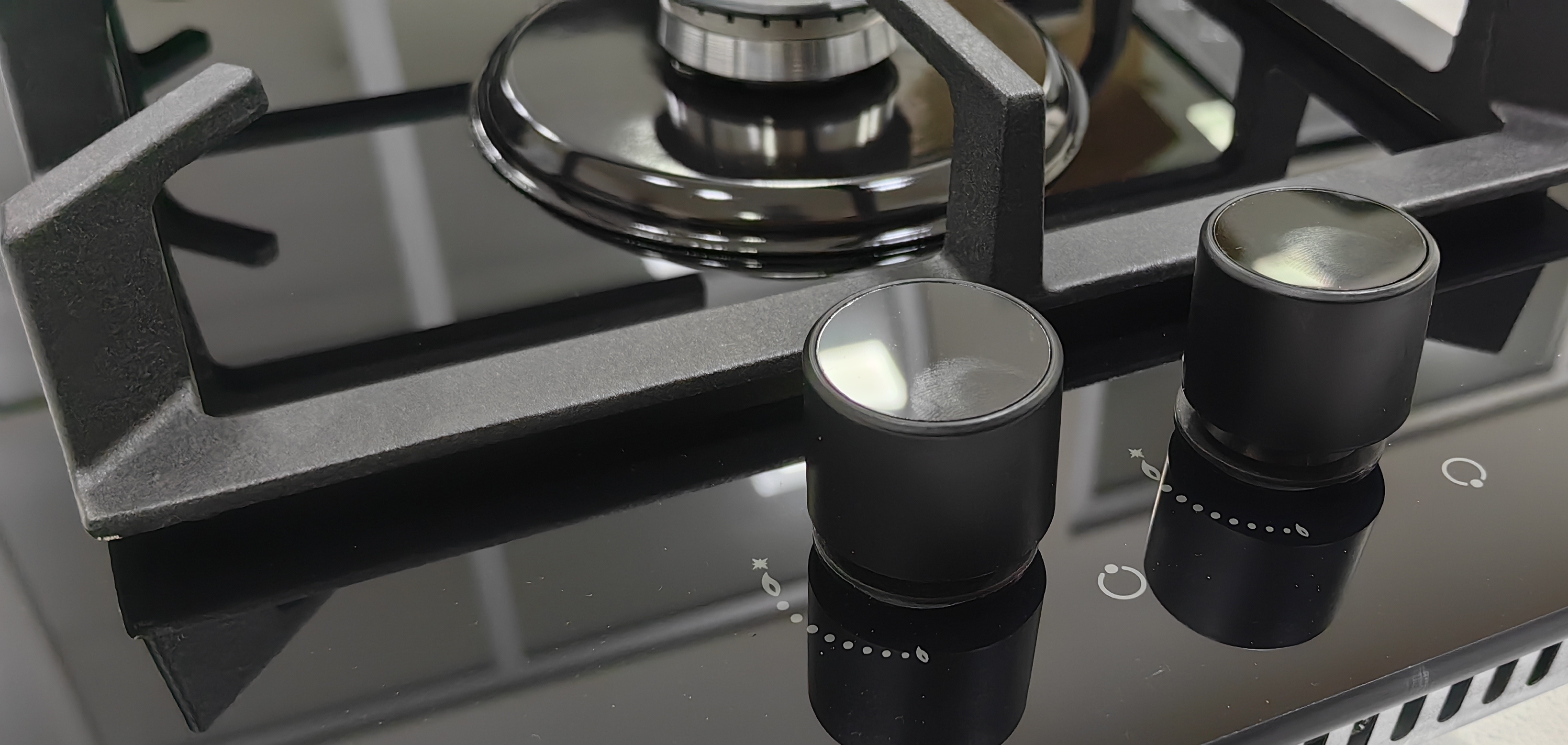 Черное закаленное стекло, Управление спереди, Ручки с электроподжигом, Газ-контроль, Колпачки горелок, Газовые
